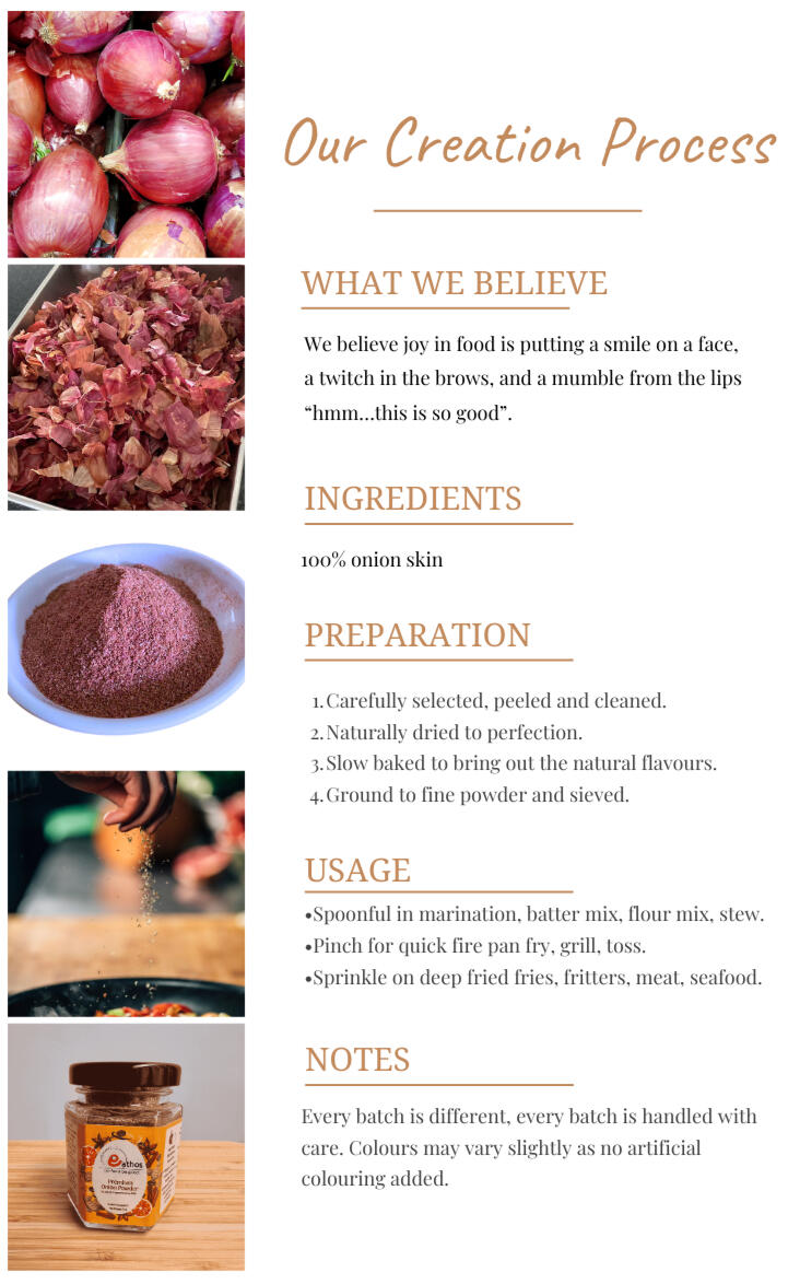 Driven by burning passion for food made as pure as possible, we strive to create products that delivers natural and nutritious meals for our children, by eliminating chemical additives, artificial colourings, processed sugars and flavourings from our meals.Our Premium Onion Powder is one such example.
